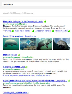 Normally if you search for manatee people, you'll see a lot of results that might include the words manatee and people, but not together. If you want that exact phrase, put quotes around your search.