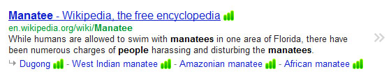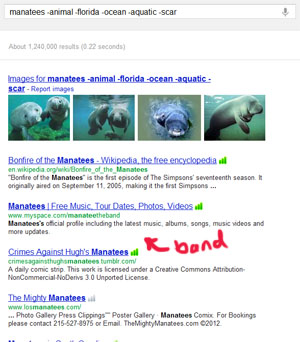 Some searches bring up a lot of false positives. Getting rid of them is easy if there's a common theme to them such as when you look for manatees the rock band, but all you get is animal pages instead. Using a few minus terms helps clear that right up.