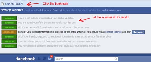 The next steps are to go to Facebook and log in. Once you are in your profile, click the bookmark and the privacy scanner will go to work. You'll see a series of colored boxes that show if your settings are set to full privacy. If not, it will warn you and give you the option of fixing the setting with a single click!